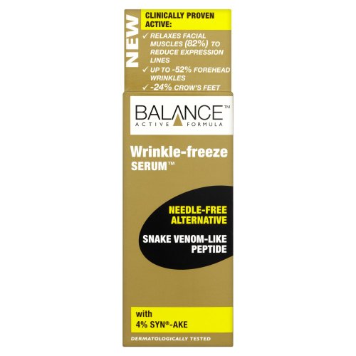 Balance Active Formula Wrinkle Freeze Serum 30 ml - Syn-Ake is a snake venom-like peptide that freezes muscles by mimicking the paralaying effect of snake venom. Clinical tests show that Syn-Ake is capable of reducing expression lilnes and wrinkles by inhibiting facial muscles contractions. Results are visible from the 1st application and are long lasting. After 1 minute the frequency of muscle contractions that cause expression lines is reduced by 36%. After 2 hours the frequency of contractiongs is reduced by 82%. After 4 weeks, up to 52% reduc