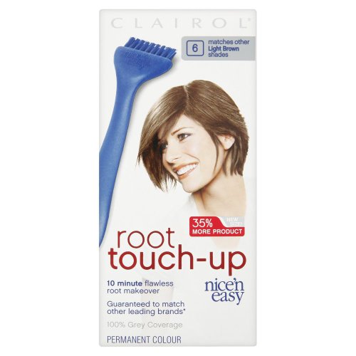 Nice 'N' Easy Root Touch Up 6 LIGHT BROWN - Clairol Nice N Easy Root Touch Up Light Brown 6 -10 minute flawless root makeover -Guaranteed to match other leading brands -100% grey coverage The flawless beauty makeover for your roots...just ten minutes between colourings Why is Root Touch Up different? Root Touch Up is specially designed to target new root growth and restore beautiful, natural looking colour in just ten minutes between colourings. How does it work? Our Precision Colour Brush allows you to easily apply the Colour Matching Ro