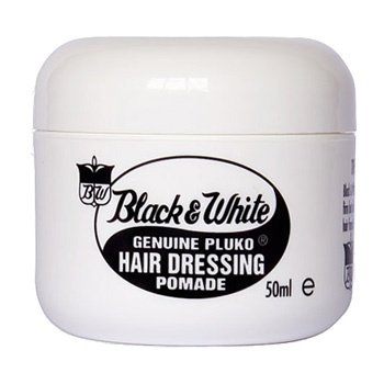 Black and White Pluko Hair Dressing Pomade 50ml - Black & White Wax Original Genuine Pluko Pomade is a versatile hair dressing that allows you to mould, sculpt and create texture. It is firm but pliable giving long hold control that lasts all day, as well as superb shine. It's great for taming thick hair and styling choppy bobs or mohawks. Simply work a small amount of the Genuine Pluko into your hair from the roots, through the mid-lengths and to the ends with your fingertips and style to achieve desired effects.